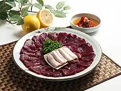 - Mungtigi. It is sliced raw bottom round steak, which can be seen all over the country, but Daegu's is the most famous. It is also called Meat sashimi, and unlike ordinary Korean-style raw beef, raw meat is served without shredding or seasoning, and is dipped in soy sauce and red pepper paste.