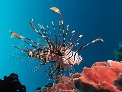 The Pterois genus, most commonly known as lionfish are a venomous fish characterized by conspicuous warning coloration with red, white, creamy, or black bands and venomous spiky fin rays. Stings are extremely painful and can lead to nausea, convulsions, temporary paralysis, heart failure, and, in extreme cases, death. Young children and people with weak immune systems are particularly susceptible.
