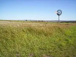 Various vegetables, beans, cotton, wheat, barley and sorghum are grown on the hill country of the Darling Downs. Long roads, bushes, meandering rivers and herds of cattle stretch between the farmland and characterise the region. Other typical landscapes in the region include irrigation systems, windmills driving pumps and water from the Great Artesian Basin, light aircraft spraying fields, old sheep shearers' huts and other scattered relics of a bygone era from the early days of European settlement.