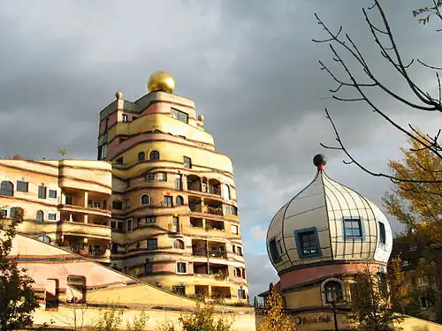 - 🌍 Waldspirale (Forest Spiral), Waldspirale (next to Friedberger Straße, between Bad Nauheimer Straße and Büdinger Straße). The huge Hundertwasser house was finished in 2000. It is a wonderful example for the colourful architectural designs of Friedensreich Hundertwasser, the famous Austrian architect and painter. The residential building has an interesting spiral shape, "green roof", and of its 1048 windows, no two are the same.