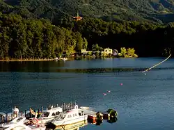 • 🌍 Longshui Lake Tourist Resort (龙水湖旅游度假区), Yulong Town (take a long-distance coach to Longshui Bus Station (龙水汽车站), then take bus no 208 and get off at the Longshui Hot Springs Center (龙水温泉中心) bus stop; you may also catch bus 208 from outside Dazu Bus Station), +86 23 85311666. This is Dazu's second biggest tourist attraction after the Dazu Rock Carvings. Situated on the northern side of Longshui Lake (actually a man-made reservoir), the resort features numerous hot springs and a water-based amusement park. You can also go on boat rides on the lake or try out a military style obstacle course that runs through a forested area. ¥138 for entry to the amusement park, ¥50 for tour boat ride, ¥70 for sailboat ride, ¥60 to use the obstacle course. OSM directions