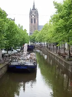 - 🌍 Oude Kerk (Old Church), Heilige Geestkerkhof 25, ☏ +31 15 212-3015. Closed on Sundays. This is Delft's oldest church, built in 1246. The interior of this church is excellent. Famous Dutchmen are buried in this church, including: Piet Hein, Maerten Tromp and Johannes Vermeer. The Old Church leans out considerably over the Oude Delft canal. When the tower was built the canal had to be moved away from the church as the tower would have been half in the water. During the building works it became apparent that canal-half of the base soil was not firm enough to support the tower. To compensate for the tilt the upper part of the tower was built with a compensating counter curve. See New Church, since it's one ticket for both, but only the New Church tower may be climbed.