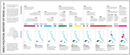 - 🌍 Qila Rai Pithora — Founded in perhaps the 11th century as a city named "Lalkot" under Hindu rule, in the current Mehrauli area. In around 1180, Hindu ruler Prithviraj Chauhan expanded this city and renamed it Qila Rai Pithora. Some of the ruins of the fort ramparts from this period are still visible around Qutb Minar and Mehrauli.