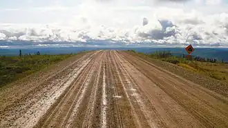 A wide variety of different road surfaces will be encountered by travelers on the Dempster. This surface is gravel or dirt and is littered with a landscape of craters and potholes that will often slow your pace down to 20 km/h (12 mph), or destroy your suspension. Be constantly on the lookout for massive potholes on any part of the road. These will sneak up on you suddenly after a comfortable few miles.