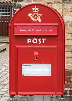 The national postal service in Denmark is run by PostNord. Digital postal stamps are available: you pay for the postage on the PostNord website, write the provided 12-digit code on the envelope, instead of using a physical stamp. Postal franchises (posthus) sells postage stamps and can be found in many supermarkets and grocery stores all over the country. Business drop-ins (erhversindlevering) does not sell postage stamps. An unregistered priority (airmail) postcard or letter with a weight of less than 100 grams is 50 kr (approximately €6.70) for all international destinations (as of 1 January 2024).