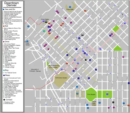 - 🌍 Hyatt Regency Denver at Colorado Convention Center, 650 15th St, ☏ +1 303-436-1234, fax: +1 303-486-4450, qualitydencc@hyatt.com. 37-story downtown hotel, adjacent to the Colorado Convention Center. 1,100 guest rooms, with views of the mountain and downtown.