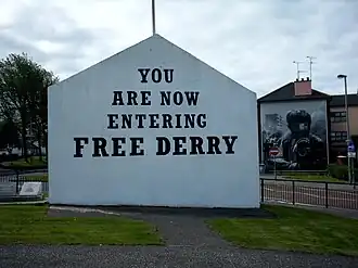 - π Free Derry Corner is the junction of Rossville Rd / Lecky St with Creggan Rd. A monument marks the bounds of "Free Derry", the fiercely nationalist quarter of town during the height of the Troubles. Building gable-ends around are painted with the "Bogside Murals" of political art, and another monument commemorates the peaceful protestors gunned down by the British army on Bloody Sunday. Today, it is co-opted for various political movements and memorials via permit at various times of the year, such as for LGBTQ2+ rights and Palestinian solidarity.