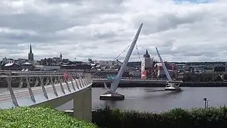 - π Peace Bridge is the footbridge spanning the river between Foyle Embankment city-side and Ebrington Square waterside. An artful modern structure of 2011, it symbolises what you'd expect it to symbolise, but more practically it greatly improves pedestrian access between the two banks.