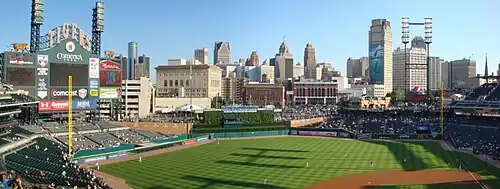 - π Comerica Park (Detroit Tigers baseball), 2100 Woodward Ave (stadium bound by Witherell, Montcalm, Brush, and Adams Sts), β +1 313 962-4000. Take in a ballgame at the Tigers' marvelous ballpark, with its magnificent views of the downtown skyline, a fountain beyond the center field wall, and tiger statues that growl every time the Tigers hit a home run. The concourse beyond left-center field has statues of famous Tigers players, including Willie Horton, Hank Greenberg, and Ty Cobb, and there's also a small Ferris wheel and a carousel for the kids. Tickets range from $15 for standing room areas to $72 for a seat behind home plate.