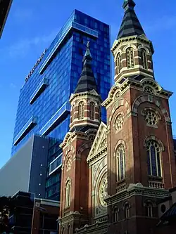 - π Fort Street Presbyterian Church, 631 W Fort St. This church was constructed in 1855, and completely rebuilt in 1876. It is an ornately detailed Gothic Revival structure built of limestone ashlar. The facade features a 265-foot (81 m) tall square tower with a spire on one side and a shorter octagonal turret on the other. A central stained glass window illuminates the sanctuary. There are seven bays along the side of the church with flying buttresses, crocketed finials, lacy stonework and tall windows, which was designed to give the impression of light.