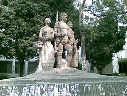 - ๐ Aparajeya Bangla (Unvanquished Bengal), University of Dhaka, in front of the Faculty of Arts. A statue dedicated to those who died in the 1971 Liberation War. Designed by sculptor Abdullah Khaled it is built of reinforced concrete and reaches a height of 11 ft (3.4 m). It was inaugurated on 16 December 1979. The sculpture consists of three humans with the central figure of a farmer carrying a gun on his shoulder and a grenade in one hand. On the left is a woman carrying a first aid box and on the right is a bare-bodied young man carrying a gun. The statue represents the general public of Bangladesh, who fought for the 1971 Liberation War.