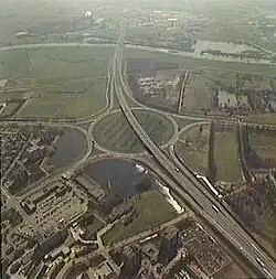 The Velperbroek interchange. In the distance are the river IJssel and Westervoort. In the bottom left is Velp.