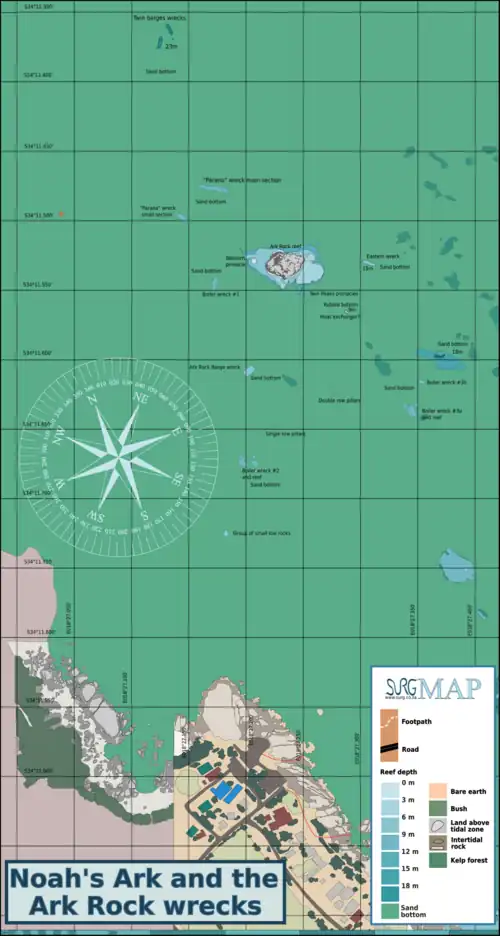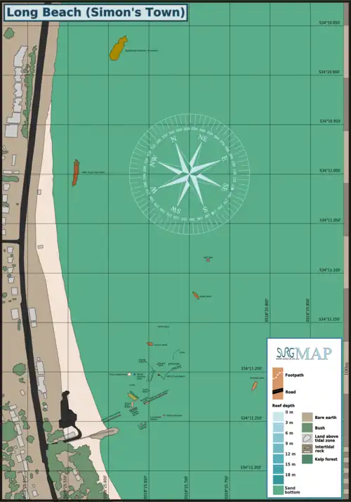- 🌍 Seal Rock: S34°15.3370' E018°28.8920' — A fairly large flattish rock used as a haulout rock by seals with fairly shallow reef around it.