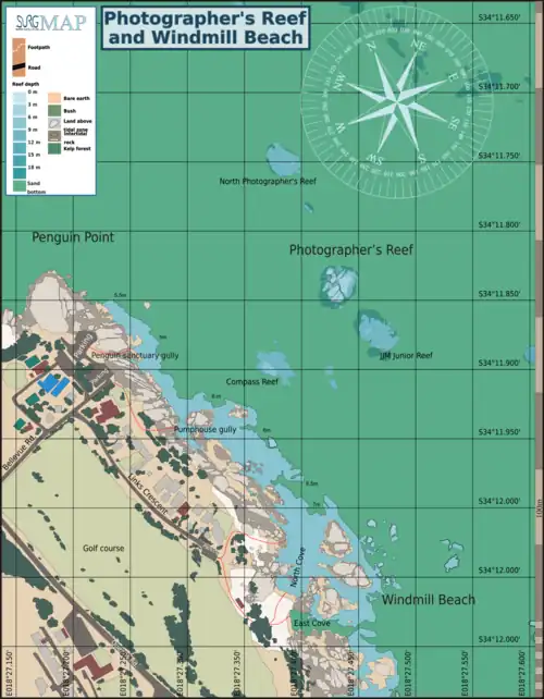 - 🌍 Partridge Point - Big Rock: S34°15.4650' E018°28.7880' — A large exposed rock marking a moderate depth area of high profile reef with a large swimthrough and a small air-trap overhang. Maximum depth about 21 m on the sand to the south and east.