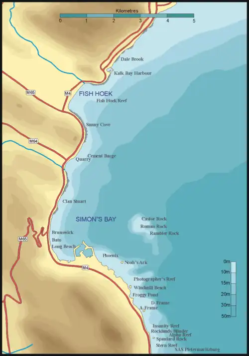 This listing of dive sites of the Cape Peninsula east coast is part of the regional guide for Diving the Cape Peninsula and False Bay which is intended to provide the already qualified scuba diver with information which will help to plan dives in the waters of the Cape Peninsula and False Bay, whether as a local resident or a visitor. Information is provided without prejudice, and is not guaranteed accurate or complete. Use it at your own risk. Expand or correct it when you can.