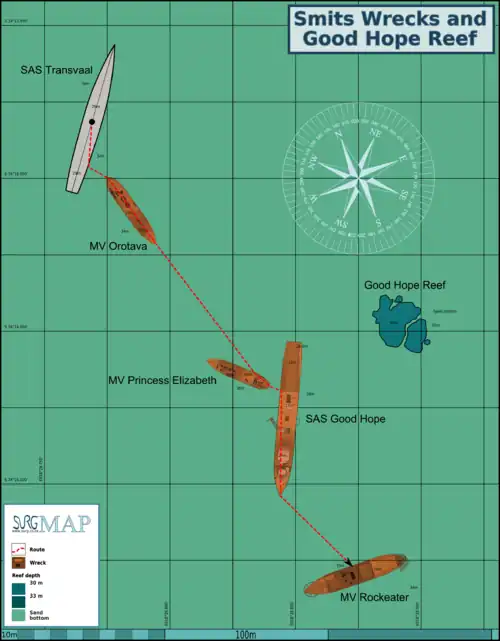 - 🌍 SAS Transvaal: S34°15.956’ E018°28.778’ (Bow)