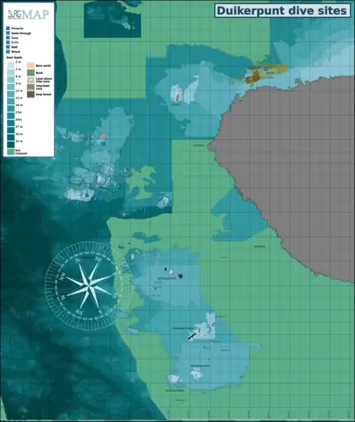 - This half-tide rock off Duiker Point is a good site with rugged topography, good biodiversity and large depth variation. Huge boulders are stacked, with tunnels, overhangs and caves of various sizes, and lots of vertical walls, some probably 10 m or more in height.