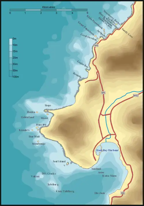 - A shallow reef below Chapman's Peak, which is close to Hout Bay harbour and is suitable for night dives. One of the few areas where the granite is not rounded by weathering, as can be seen from the cliffs above the site.