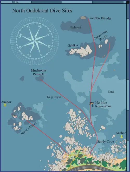 This listing of dive sites of the Cape Peninsula west coast is part of the regional guide for Diving the Cape Peninsula and False Bay which is intended to provide the already qualified scuba diver with information which will help to plan dives in the waters of the Cape Peninsula and False Bay, whether as a local resident or a visitor. Information is provided without prejudice, and is not guaranteed accurate or complete. Use it at your own risk. Expand or correct it when you can.