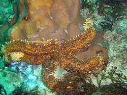 A variety of fish and invertebrates can be seen: Turncoat hogfish, Devil firefish, Scorpionfish, Halfmoon rockcod, Crown squirrelfish, Black spotted blaasop, Yellow snapper, Barred filefish, Goldies, Blacksaddle goatfish, Clown triggerfish, Longnose butterflyfish, Moorish idol, Loggerhead turtles, Zigzag oyster, Radial sea pen/dead man's fingers, Desmarestia seaweed, encrusting coralline seaweeds, Dark grey turreted ball sponge, white encrusting colonial ascidian, branched black corals, white feathery hydroids, brown feather stars, Lobster, Striped and spotted anemones. buried sea cucumbers, cleaner shrimps, brown and orange spiky starfish, Slender brown squirts, Octopus,