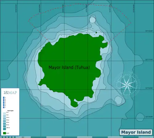 Mayor Island is a dormant shield volcano off the Bay of Plenty coast of New Zealand's North Island. It is 35 km (22 mi) north of Tauranga and has an area of 13 km² (5 sq mi). The island has a mostly precipitous coastline, and maximum height of 355 m (1,165 ft) above sea level.