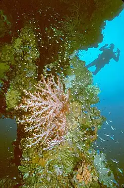 The coral encrusted wrecks attract a diverse array of marine life, including manta-rays, turtles, sharks and corals. In 2007, 266 species of reef fish were recorded by an Earthwatch team and in 2006 the rare coral Acropora pichoni was identified.[