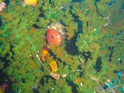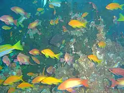 Honeycomb moray, Bluestreak cleaner wrasse, Small red wrasses, Red spined stars, Red-brown bowl sponge, Old woman Pomacanthus rhomboides, Goldies, Greentree corals, Epaulette soldiers, Dominos, Crown squirrelfish, Red sea fans, Maroon sponges, Spotted unicorn fish, Surgeonfish, Dusky rubberlips, feather stars, Blue tangs, nudibranchs.