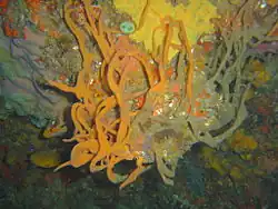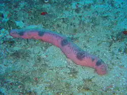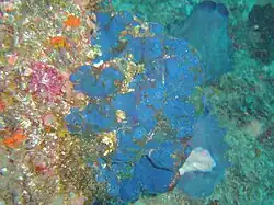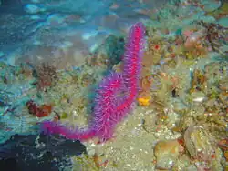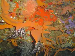 Large variety of sponges, Diana's Hogfish, Shortspine porcupine fish, Natal knifejaw, Black edged butterfly fish, Nine striped cardinal, Band tail cardinal, Red fanged triggerfish, Clown triggerfish, Manta, Devil rays, Red armpit starfish, Red spined star, Spotted green cushion star, Brown feather stars, Black and white banded feather stars, Lilac colonial squirts, Red split fan sponge, Orange arch sponge, Bright blue encrusting sponge, Pink sea cucumber with black blotches, Red whip coral with blue polyps, Soft brown plate coral, white spotted Partner shrimp. Big blue anemone, Brittle star, White feather duster worm, Red sea fan, turtles.