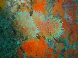 Wide variety of fish and reef invertebrates: Anemone fish, Two bar clownfish, Devil firefish, Emperor angelfish, Scorpionfish, Balloon porcupinefish, Longnose butterfly fish, Whitespotted butterfly fish, bluestreak cleaner wrasse, Spotted hawkfish, Dominoes, Yellowback fusilier, Spotted hogfish, Five lined cardinal fish, Paperfish, Honeycomb moray, Cave bass, Moorish Idols, Blue tangs, dark surgeonfish. Toby, Blacktip kingfish. Cushion stars and other stars, sea cucumbers, nudibranchs, shrimps, lobster, Thistle soft coral, Egg cowrie, yellow bowl sponge, Trumpet fish, zigzag oyster, Fleshy soft coral, giant anemone, Various sponges, Tube anemone with light blue tentacles, Greentree coral, Black feather stars, orange encrusting sponge, small purple, yellow and black colonial squirts, honeycomb coral, Small brown and yellow crabs, Warty off-white cucumber, brown star,