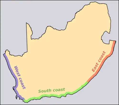 South Africa's coastal waters can be divided into a number of biogeographical regions, though there is generally not a sharp distinction between them where the boundaries have been placed. There is more of a gradual change along the coast, from the tropical waters of northern KwaZulu-Natal to the cooler waters of the south coast.