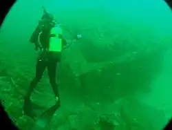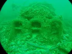 Scattered wreckage of a historical wreck of great cultural significance. The wreckage includes remains of the paddle wheels, boiler and engine, which is a very early model and quite interesting in design. There are also a few anchors, cannon and similar generic type artifacts.