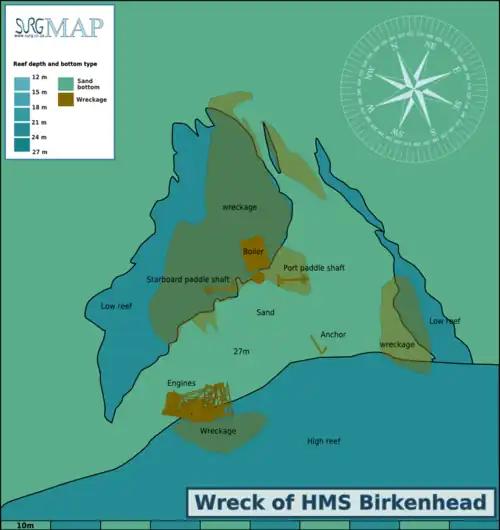 The large sandstone reef to the south east of the wreckage with a pinnacle at the blinder known as Birkenhead Rock slopes down to about 27 m at the edge of the sand, which runs roughly east–west magnetic. The slope of this reef is quite steep to the east, but flattens out a bit where the engines of the wreck lie stacked at the edge of the sand.