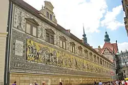 - 🌍 Fürstenzug (Altstadt, near Brühlsche Terasse). This biggest porcelain painting of the world shows (almost) all Saxon princes, electors and kings on their horses and splendid parade uniforms. (There is only one female person at the painting, find her.) It leads to the "Stallhof" - the last preserved tournament place contained in a European castle. In winter, the Stallhof is the location of a medieval style Christmas market with a big fireplace.