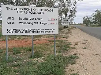 If you encounter a gate on a public road or thoroughfare in the outback it may have a sign on it (or nearby) advising of the roads entrance conditions and gate closure requirements. The Dingo Fence or Dog Fence is a notable example of such formal gating. This fence is one of the longest structures in the world and is the world's longest fence. It stretches 5,614 km (3,488 mi) from Jimbour on the Darling Downs near Dalby in Queensland through thousands of kilometres of inland Australia finally ending west of Eyre peninsula on cliffs of the Nullarbor Plain near Nundroo 160 km west of Ceduna and 347 km east of the South Australian-West Australian border. Any gate on this fence must be closed at all times other than when a vehicle is actually passing through the gate. Other gates range from very formal solid constructions down to humble bush gates using many different methods of closure. The rule with these gates is to always leave it as you found it. If it is open leave it open, if it is closed then you must close it again and ensure that it is done properly. Pay very careful attention when you first open the gate to ensure that you fully understand how to close it again. If you are travelling close behind another vehicle they may open the gate and then drive on, leaving you to close the gate. Pay careful attention to any such situation to ensure there is no confusion as to the status of the gate upon arrival (open or shut) and who is closing it, do not just drive off unless you can see the gate is being properly managed by others, traditionally the onus is upon the last one through to close the gate; however if you opened it you still have the ultimate responsibility to ensure that it is left as you found it including being correctly fastened. Heavy grazing stock losses or intrusion of feral animals may arise from incorrect gate management by travellers. In some cases penalties may be applied for not following correct procedures where closure is mandated.