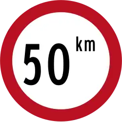 Unless otherwise posted, speed limits in Indonesia is at 30 km/h (19 mph) on residential roads, 50 km/h (31 mph) on urban roads, 80 km/h (50 mph) on rural roads and 100 km/h (62 mph) on toll roads. Speed limits are indicated by a red circle, with the speed on red numerals and followed by km (in superscript) on the right, similar to the pre-1960s speed limit signage of several European countries. There is zero tolerance for speeding, but enforcement is spotty.