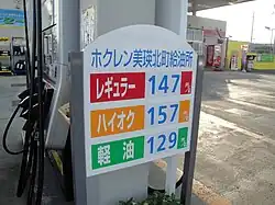 Fuel is more expensive than in the USA, but generally cheaper than in Europe. Most cars use regular (レギュラー) fuel, shown in red. Diesel (軽油 keiyu) is green, high-octane (ハイオク) is yellow or blue.