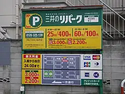 Street parking is virtually non-existent in Japanese cities and rare even in rural areas. Instead of giant parking garages, it's more common to have tiny unmanned lots of paid parking for ¥300-400/hour, typically capped at around ¥2,000 for all-day parking (最大料金 saidai-ryōkin, "maximum cost"). Spaces marked 軽 are intended for kei cars only and will not fit a regular car. Often every space is numbered and equipped with a device to physically lock in your car until you pay up, most commonly a bar that pops up under the car. Payment is often cash only. After paying, you have a couple of minutes to move out.