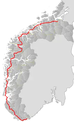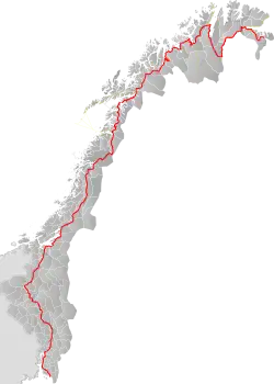 | Norway's main road and a key reference for driving in Norway. From Halden at the Swedish border to Kirkenes at the Russian border, a total of 2628 km (and some 500 km in Sweden). | Dovre, Saltfjellet(some exposed to rough weather in winter) | 1 ferry | Motorway Halden to Hamar. Congestion near or inside Oslo at rush hour and weekends. | Several scenic stretches. | ||