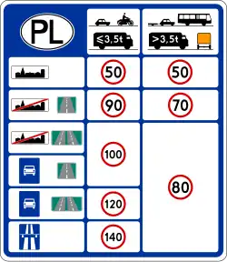 - 100 km/h on single carriage way expressways (white car on the blue sign),