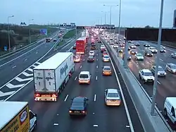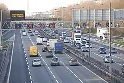 There are some variable mandatory speed limits on a number of busier motorways (known as "smart motorways") - these are shown on overhead gantries inside a red circle; other temporary speed limits shown on matrix boards are recommended but not mandatory. Apart from these and around roadworks, the motorways are generally free of fixed speed cameras. Perhaps as a result, many drivers drive much faster on motorways than the stated speed limit (often around 80 mph/130 km/h), although you will be prosecuted if caught. Driving at slower speeds in the outside (overtaking lane) may cause frustration to other drivers and is an offence punishable by a fine. The same applies to tailgating - driving too close to a slow-moving vehicle in front.