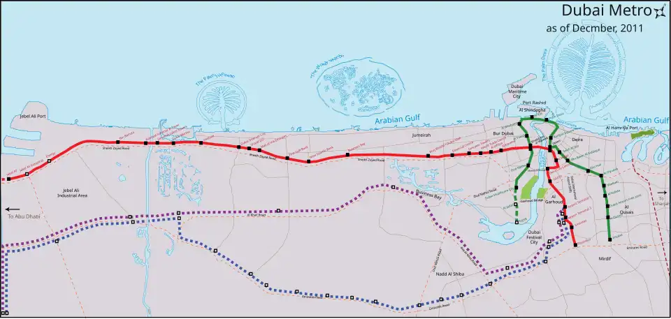 The Red Line is 52 km (32 mi) long and opened in September 2009. It's the second metro in the Arab world after Cairo. While the line does not serve the old city centre, it's handy for zipping along Dubai's long coastline and includes stops at the airport, Burj Khalifa and the Mall of the Emirates. The track 2020 expo - an extension of the Red Line - was completed in 2020.