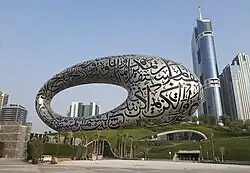 - π Museum of the Future, Emirates Towers, Sheikh Zayed Rd, Trade Center 2 community (get out at Emirates Towers metro station), toll-free: 800 2071, info@museumofthefuture.ae. Daily 10:00-18:00. Branded as a "technology museum" many visitors consider it more of an expensive art exhibition. The building is outstanding though and looks particularly impressive in the dark. 145 dirham.