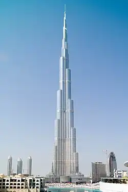- π Burj Khalifa (Khalifa Tower). At 828 m and 160 floors this is the world's tallest structure by a long shot, over 300 m taller than the previous contender in Taipei. The observation deck at the 124th floor is the second highest in the world after the Shanghai World Financial centre. Dominating the Dubai skyline, the tower houses a hotel and a Las Vegas-inspired fountain system. The visitors' entrance is at the lower ground floor of Dubai Mall. Although the tour is called At the Top, it isn't! At 452 m it's just over halfway up the tower itself. Console yourself with the knowledge that most of the rest of the tower consists of service areas and the view below looks suitably ant-like. Tickets cost 125 dirham for a timed entry ticket, usually later the same day, or 400 dirham if you do not want to wait. Tickets can sell out several days in advance, and it is advisable to book them online ahead of your visit. For 500 dirham you can book a 'sky' ticket, that includes a trip to level 148 of the building for 30 minutes, sweets and drinks, before returning to the level 125 (which is empty and exclusive). It also includes a brief tour of the building private areas. If you go for 'sunrise+breakfast' option for 140 dirham you can visit floor 124 at 05:30 and after, with floor 125 opening at 08:30 - this is a great way to avoid the queues and see the city during both night and day.