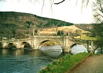 - 🌍 Wade's Bridge spans the Tay. Highland roads at the start of the 18th century were often little better than cattle tracks, struggling through fords and bogs. In 1715 the Jacobite rebellion rocked the government; it was quashed, but showed the need to be able to move troops swiftly into troublesome districts. General George Wade (1673-1748), as Scotland's military commander, set about building better roads and bridges. The Crieff to Dalnarcardoch road, built in 1730, crossed the Tay at Aberfeldy by this impressive bridge. Designed by William Adam, it was the most expensive structure in the whole network, and was only completed in 1734. When Wade retired, his assistant Major William Caulfeild took over, building many roads later credited to Wade, and coining the lines quoted above. Meanwhile the Jacobites rebelled again, and this time got as far south as Derby: bless these new roads!