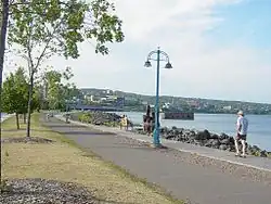 Duluth is the western endpoint of the scenic North Shore Drive, which follows the rugged north coast of Lake Superior nearly 700 miles (1,120 km) to Sault Ste Marie (Ontario). Across the bay is Superior, Wisconsin.
