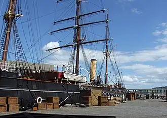 - π RRS Discovery, Riverside Drive DD1 4XA, β +44 1382 309060. M-Sa 10AM-6PM, Su 11AM-5PM. Discovery, launched in 1901, is an Royal Research Ship (RRS) specifically built for Antarctic exploration. She's a 3-masted wooden sailing ship with only auxiliary steam power, built in Dundee because its shipwrights still had expertise in polar sail-powered vessels that was being lost elsewhere. Discovery was commanded by Robert Falcon Scott, and also aboard was Ernest Shackleton. They reached Antarctica in early 1902 (austral summer), intending to spend one winter, but the ship became icebound for the next two years. They were just about to abandon ship in Feb 1904 when the ice broke and they escaped homeward to public acclaim. Both men were to return: Shackleton in 1907-09 didn't quite reach the South Pole, but survived. Scott in 1910-12 did reach it, but behind Amundsen, and all his party perished on the trek back to the coast. The museum has an extensive display of the 1902-04 expedition, then you go aboard the dry-docked ship, which had a later career as a polar merchant vessel. Adult Β£17, conc Β£13, child Β£9.50, combi with Verdant Works adult Β£24.50.