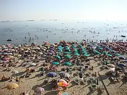 - 🌍 Golem beach (Plazhi Golemit/Mali i Robit), Golem, Mali Robit, Kavaja Rock (Shkembi i Kavajes) (follow SH4 and enter secondary road at Plepat roundabout (SH56, SH85) or continue along SH4 and exit at Golem/Mali Robit exit). This is the main seaside resort south of Durrës with long sandy beaches popular among Albanians and foreigners alike. Tirana inhabitants have their beach houses and villas in the area for weekend and summer retreats.