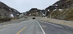 Before March 2023, the route would have continued on an older narrower tunnel, but the completion of the newer 3.56-km 🌍 Skarvbergtunnelen (sometimes Skarvberg Tunnel; Northern Sami: Sieidditunealla; Kven: Skaarpärkintunneli) has meant that you do not need to drive in a worn-down 1968 tunnel that added 1.5 km to the journey (the old tunnel still exists abandoned, if you were wondering).
