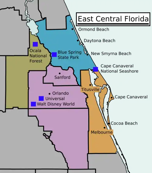 The central part of Florida's peninsula has few geographical features, and those that exist do not separate central Florida into regions. The large Orlando metropolitan area is the most significant feature that comes between the eastern and western coasts, but due to the presence of Daytona Beach and other coastal cities with little in common with the inland metropolis, the term "East Central Florida" is not a shared cultural identity. It is more accurately a group of neighboring counties β Orange, Osceola, Seminole, Volusia, and Brevard β with little in common.