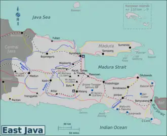 East Java (Jawa Timur) covers the eastern third of the island of Java, Indonesia, as well as the island of Madura and several small offshore islands.